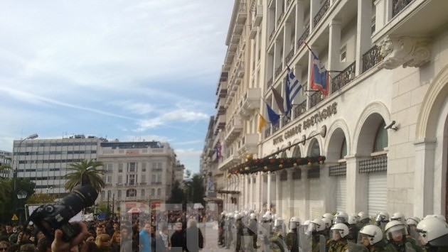 Νωρίτερα κουκουλοφόροι προξένησαν φθορές σε στάσεις λεωφορείων στη Σταδίου στο ύψος της Παλιάς Βουλής και έσπασαν κάμερες ασφαλείας δύο τραπεζών στην πλατεία Κλαυθμώνος. Ανάλογα περιστατικά σημειώθηκαν στα Χαυτεία στη συμβολή Σταδίου και Αιόλου, όταν περίπου 400 κουκουλοφόροι προξένησαν φθορές σε βιτρίνες καταστημάτων. Πέτρες από πλήθος νεαρών δέχθηκε διμοιρία των ματ στη διασταύρωση Πανεπιστημίου και Εμμανουήλ Μπενάκη. Λίγο αργότερα εκτεταμένα επεισόδια ξέσπασαν έξω από το ξενοδοχεία Μεγάλη Βρετανία, όπου διμοιρίες των ΜΑΤ βρέθηκαν σε κλοιό διαδηλωτών. Με χειροβομβίδες κρότου λάμψης απάντησαν οι αστυνομικοί.