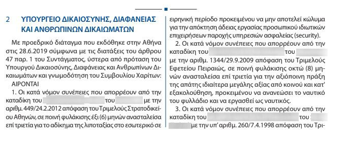 Εξάλλου, την Παρασκευή 5 Ιουλίου 2019 δημοσιεύτηκε στην Εφημερίδα της Κυβερνήσεως και δεύτερο προεδρικό διάταγμα, ύστερα από πρόταση του κ. Καλογήρου, με το οποίο αίρονται οι κατά νόμον συνέπειες που απορρέουν από την καταδίκη του (...) σε συνολική ποινή φυλάκισης ενός έτους και έξι μηνών «για την αξιόποινη πράξη της διευκόλυνσης, προώθησης και μεταφοράς στο εσωτερικό της χώρας δύο αλλοδαπών στερουμένων των νόμιμων ταξιδιωτικών εγγράφων», προκειμένου να αποκτήσει την ελληνική ιθαγένεια με πολιτογράφηση.