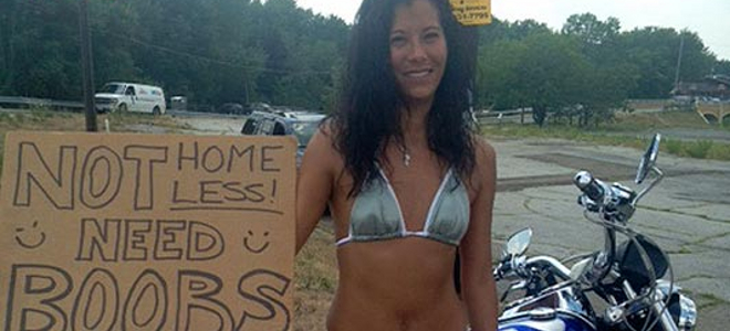 Εβαλε το μικροσκοπικό μπικίνι της και τις μπότες της και πήρε τους δρόμους του Οχάιο, κρατώντας ένα πλακάτ στο οποίο γράφει: «Not homeless. Need Boobs», ελληνιστί: «Δεν είμαι άστεγη. Χρειάζομαι στήθος». Στόχος της να συγκεντρώσει 5.058 δολάρια.
